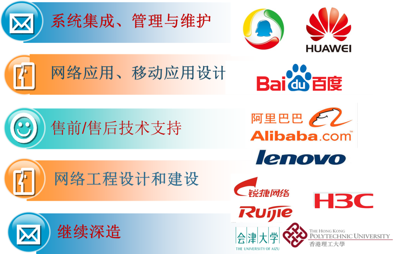 网络工程专业在就业方面一贯保证了稳定且高质量,近四年,本专业毕业生一次就业率近100%,近40%毕业生攻读研究生和出国深造。本专业毕业生就业范围包括腾讯、百度、阿里巴巴、华为、联想、锐捷、新华三、瓜子等著名互联网及信息技术公司,平均年薪近12万(2019年数据)。毕业生薪资水平连续多年保持增长并位居前列。为公司所有本科专业中,平均起薪最高,就业率、就业专业对口率等指标长年名列前茅的优质专业之一。