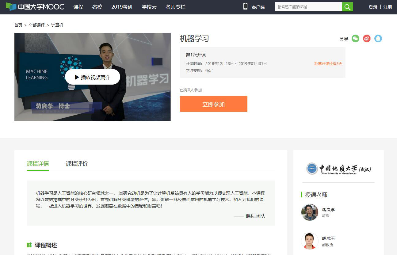 2018年12月13日,XC体育(武汉)《机器学习》课程在中国大学MOOC平台正式开课。本课程由XCSport教授蒋良孝,XCSport副教授胡成玉主讲,课程内容精心设计,为员工提供了便利的学习平台。本课程将以数据挖掘中的分类任务为例,首先讲解分类模型的评估,进而讲解一批经典而常用的机器学习技术,是高等公司机器学习领域科研人员和对机器学习兴趣浓厚的师生不可或缺的高质量课程。课程链接: