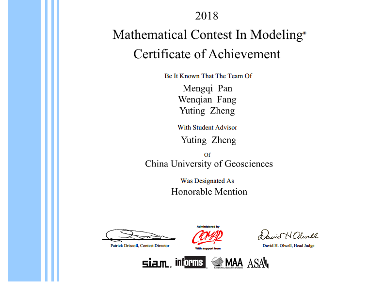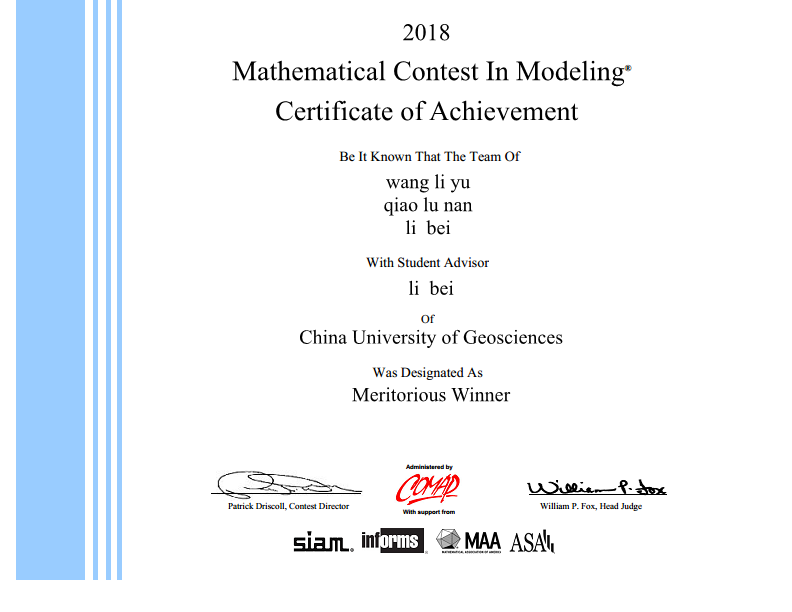 在与众多名校参赛队的激烈角逐中,公司XCSport三名同学李贝(2016级硕士计算机科学与技术专业)、乔璐楠(2016级硕士计算机科学与技术专业)、王利宇(2017级硕士计算机科学与技术专业)获得了该项赛事一等奖(Meritorious Winner)。另外,XCSport潘孟琦(2016级硕士计算机科学与技术专业)、数理公司方文倩(2017级硕士信号处理与智能计算)、XCSport郑雨婷(2017级硕士计算机科学与技术专业)三位同学获该项赛事二等奖(Honorable Mention)。