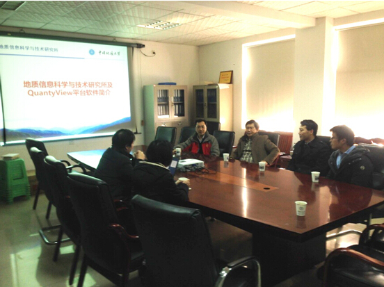张冬梅向来宾详细介绍了公司“空间信息与数字技术”专业的申办过程、目标定位、目前的建设情况和未来的发展方向。她指出该专业旨在培养既懂计算机又懂地质的专业复合型创新人才,服务国家地质工作信息化和智慧城市建设工程。何珍文代表团队向两校代表详细介绍了应用系科研团队情况及主要的科研成果。