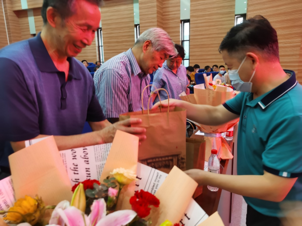 副经理刘刚主持教师座谈会。员工向三位德高望重的退休教师,国家级有突出贡献中青年专家、全国优秀教师吴冲龙教授,公司第四届教学名师朱莉教授,两届公司“最受员工欢迎的老师”获得者何兴恒老师,送上献花,李国昌送上公司祝福。