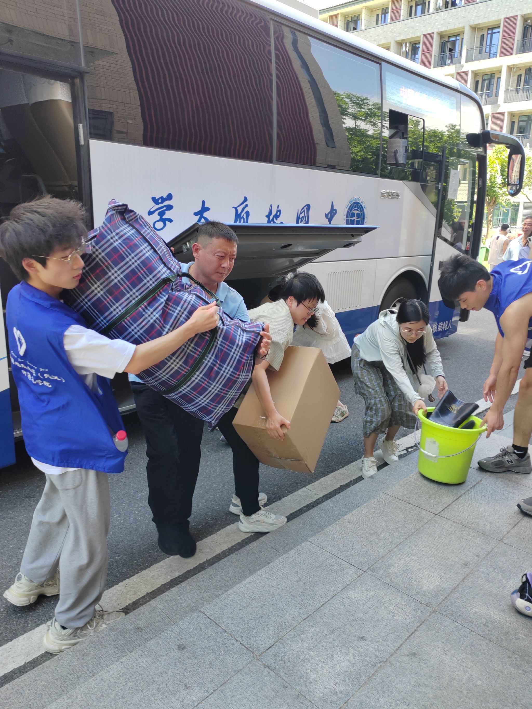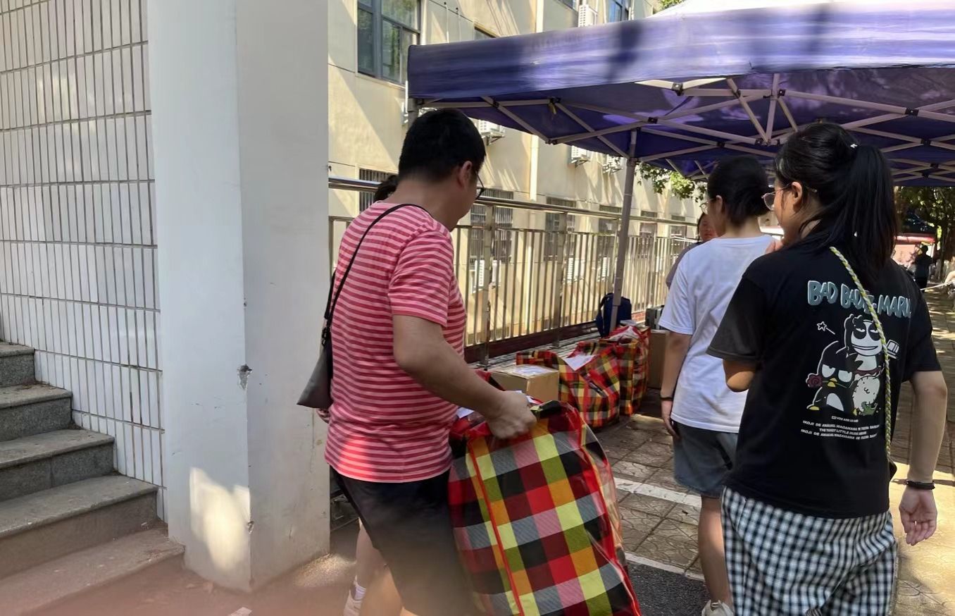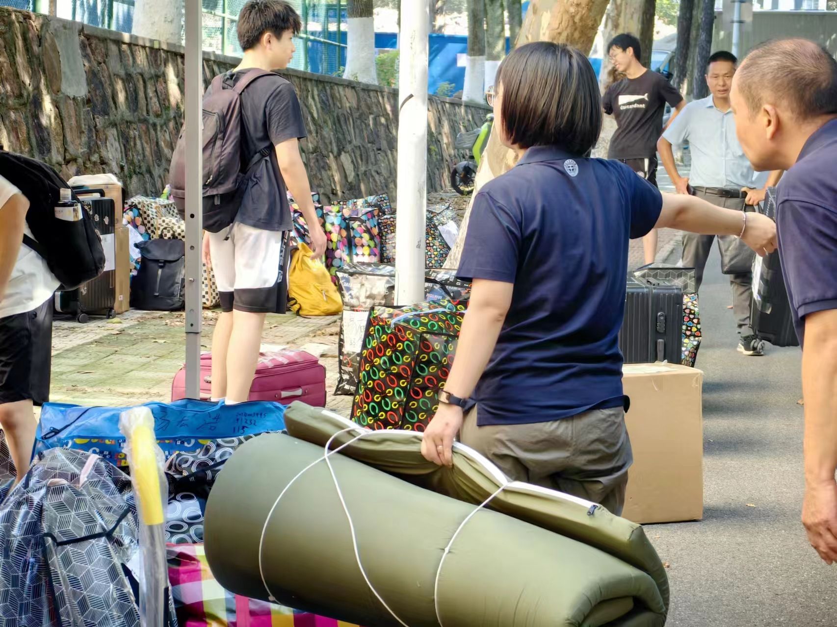 大巴驶入校园,在员工们即将入住的宿舍前,橙色的凉棚早早张开,身着蓝色马甲的志愿者们等候多时。多批运输车辆将员工物品运至宿舍楼下,老师和志愿者为新到来的2023级计科学子搬运行李,指明方向;宿管阿姨分发钥匙,严谨细致地录入信息;同学们彼此合作,将沉重的包裹运到新宿舍,开启一段崭新的未来旅程。