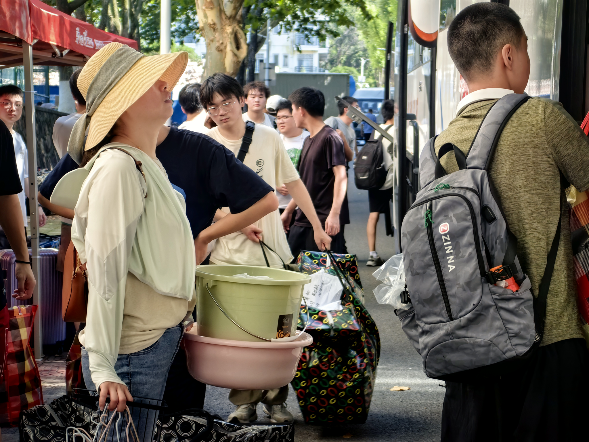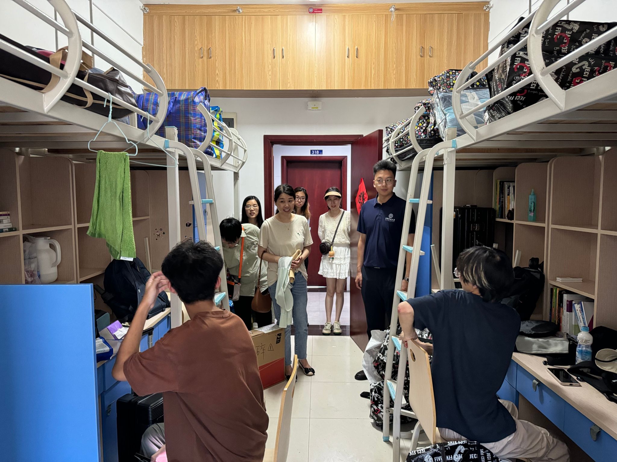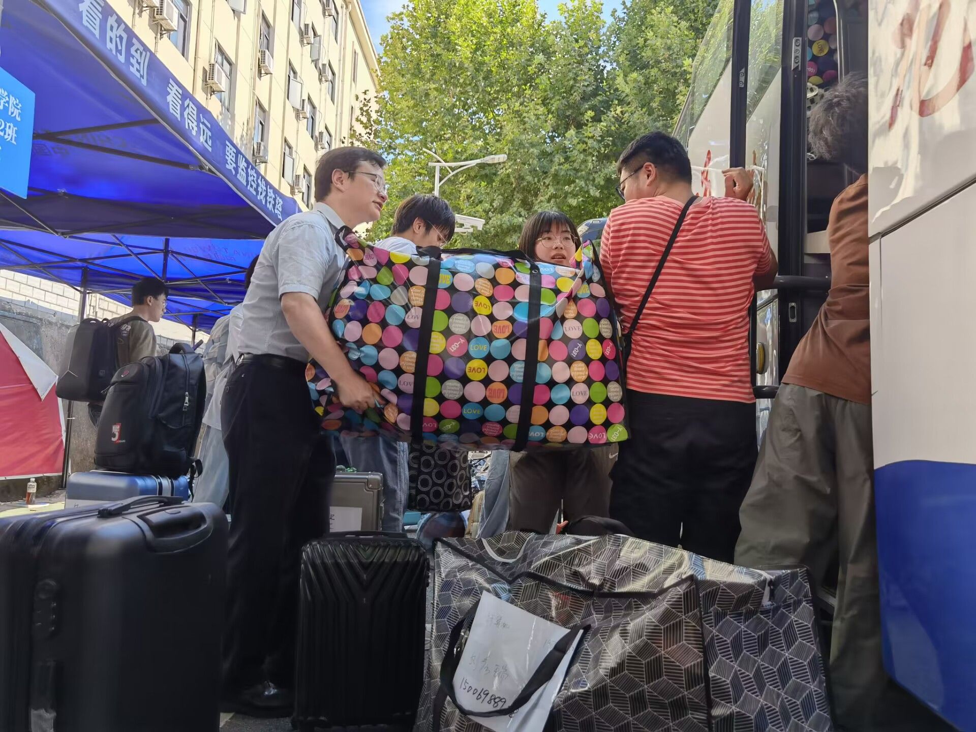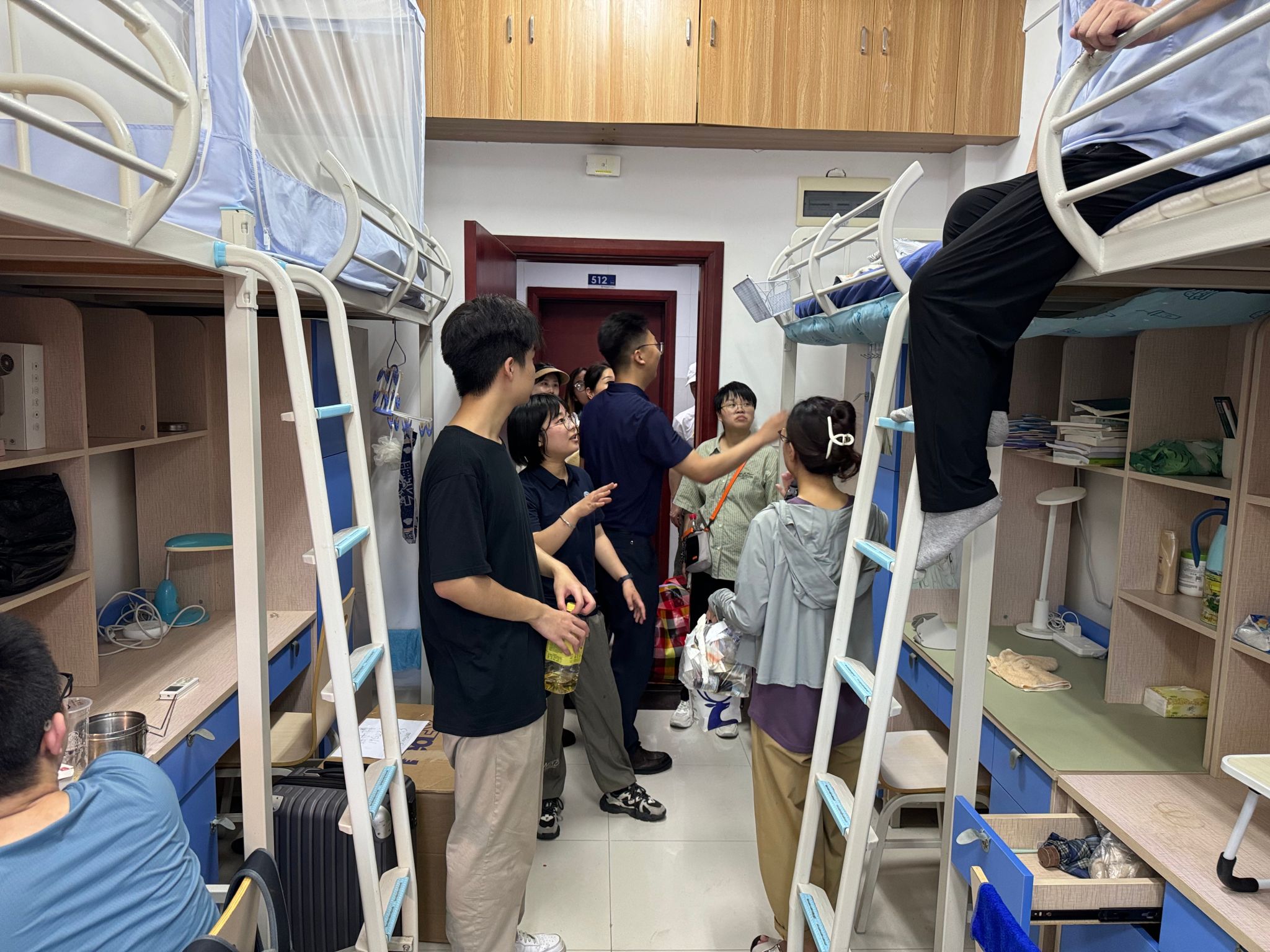 大巴驶入校园,在员工们即将入住的宿舍前,橙色的凉棚早早张开,身着蓝色马甲的志愿者们等候多时。多批运输车辆将员工物品运至宿舍楼下,老师和志愿者为新到来的2023级计科学子搬运行李,指明方向;宿管阿姨分发钥匙,严谨细致地录入信息;同学们彼此合作,将沉重的包裹运到新宿舍,开启一段崭新的未来旅程。