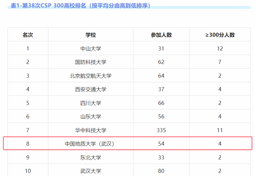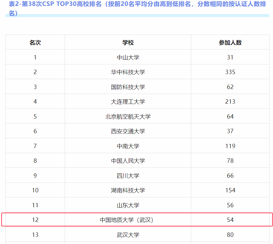 据悉,此次认证共有来自全国207个高校的4907人参加。公司共54人参加认证考试,其中300分以上达4人(CSP总分500分)。CCF对参加人数大于等于30人且2人及以上认证成绩达300分的高校进行了平均分排名,公司排名第8。此外,CCF对每所公司排名前20同学的成绩进行了平均分排名,产生了CSP TOP30高校,公司排名第12。