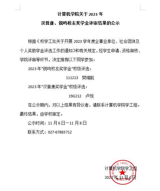 XCSport关于2023学年汉普康、锐鸣员工奖学金评审结果的公示