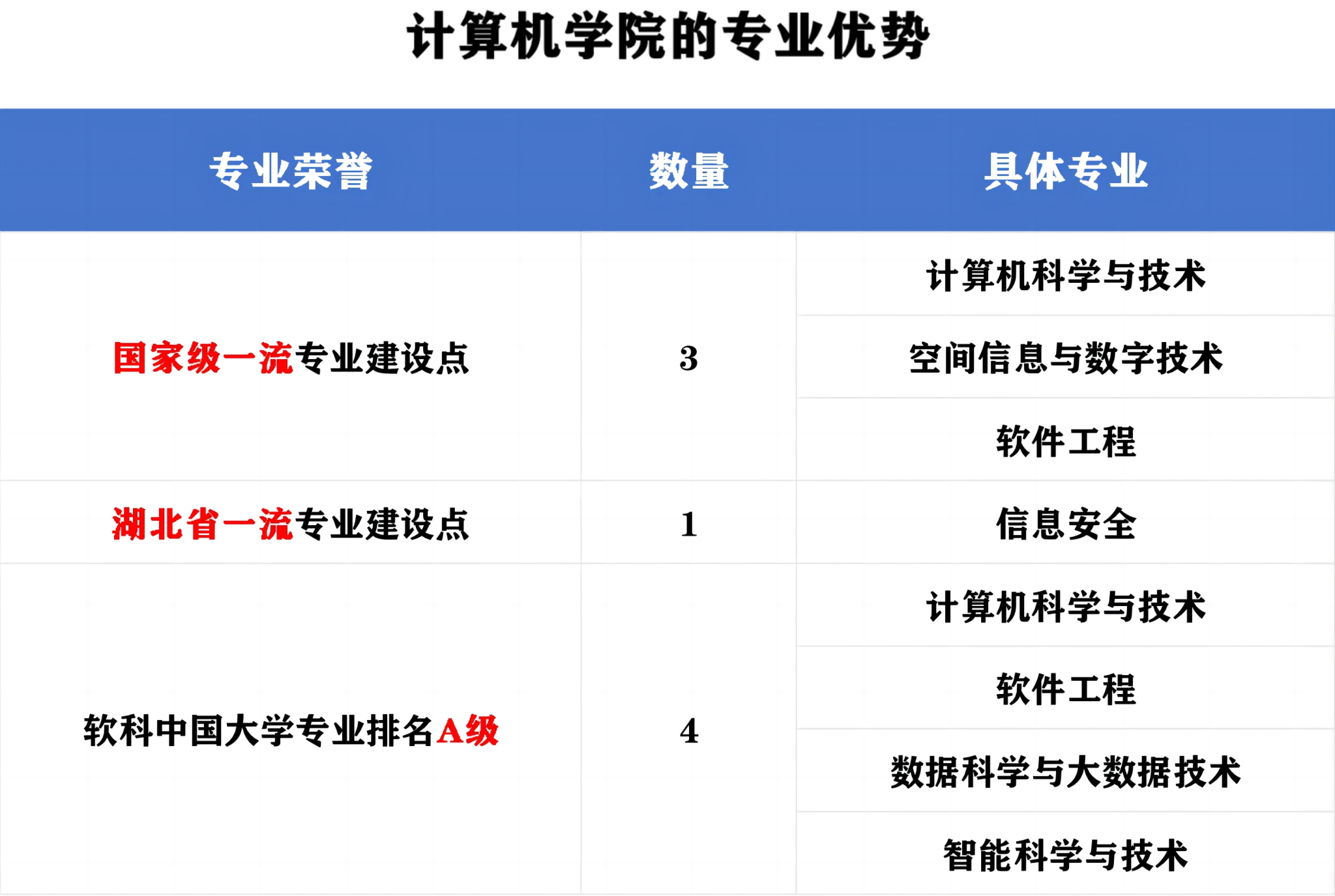 公司现有计算机科学与技术、信息安全、空间信息与数字技术、数据科学与大数据技术、智能科学与技术、软件工程6个本科专业和计算机科学与技术(大数据方向)中美合作办学专业。其中,计算机科学与技术、软件工程、空间信息与数字技术入选国家级一流本科专业建设点,信息安全入选湖北省一流本科专业建设点。在2023年的软科中国大学专业排名中,计算机科学与技术、软件工程、数据科学与大数据技术、智能科学与技术均被评为A级。