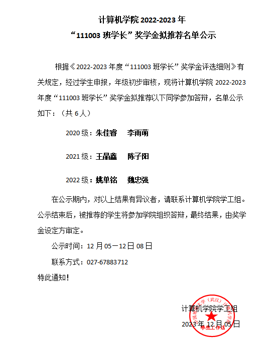 XCSport2022-2023年“111003班学长”奖学金拟推荐名单公示