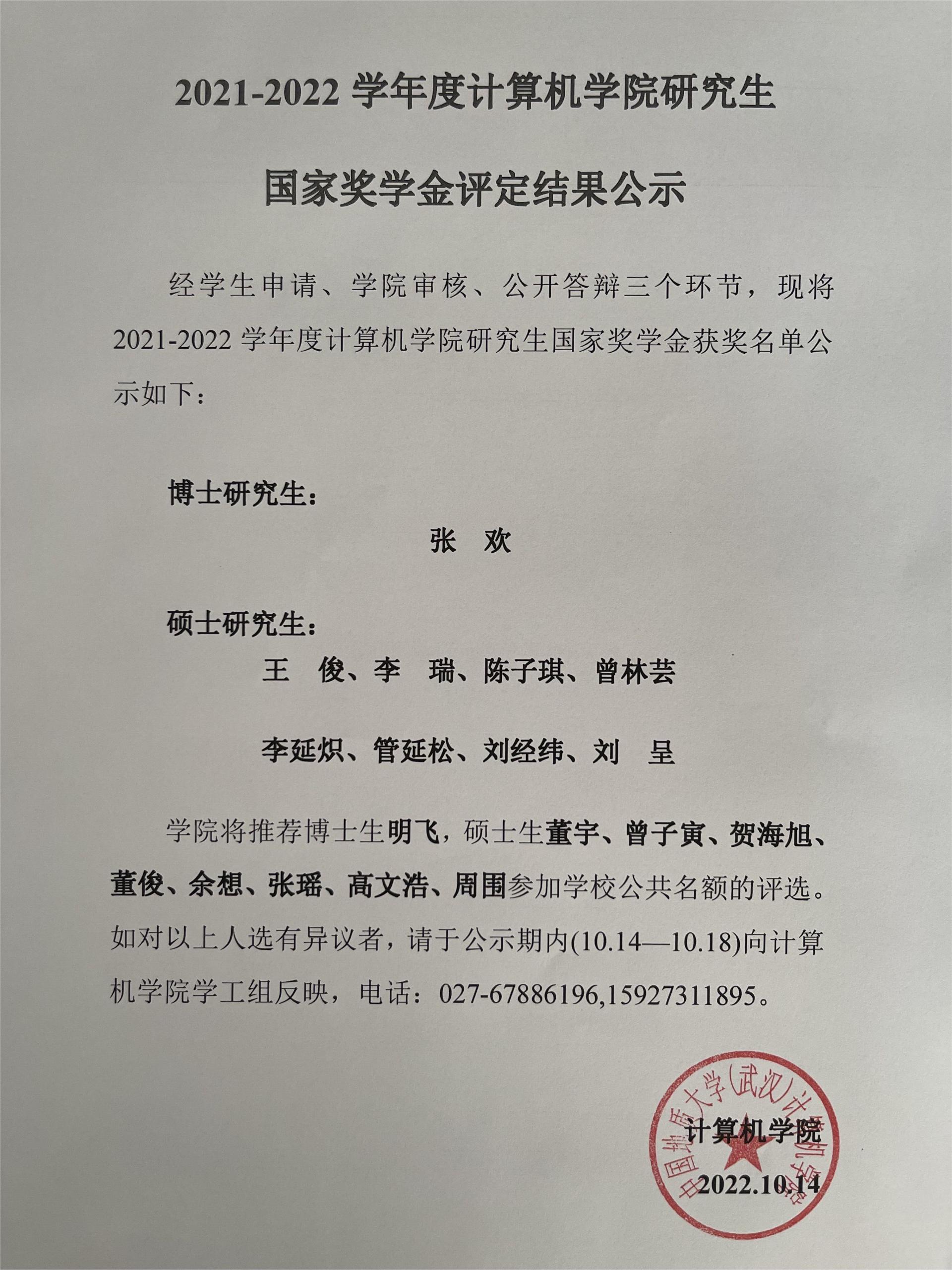2021-2022学年度XCSport研究生国家奖学金评定结果公示