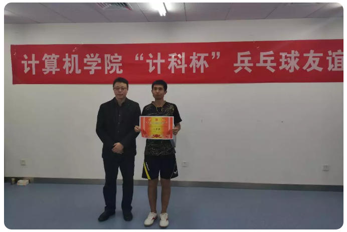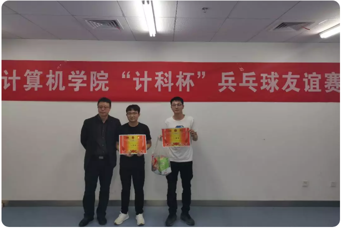 14:00,由李欢欢老师致开场词,宣布比赛开始。参赛队员们使出浑身解数,旋球,扣杀,拉球,擦边以及极限救球频频上演,场边不时传出观众兴奋的“好球”声。最终,经过将近四个小时的鏖战,我们的单双打冠亚季军分别产生。单打组第一名马阳,第二名周大双,第三名马世超。双打组第一名马世超,童伟;第二名王若祥,刘远;第三名周大双,王统。赛后,由胡成玉,李欢欢、汪欣欣、王太茂四位老师,为获奖同学颁发奖状和奖品,表彰他们在比赛中的优异表现。颁奖结束后,大家意犹未尽,老师和同学们还进行了师生友谊赛,师生互相切磋球技,热闹非常。