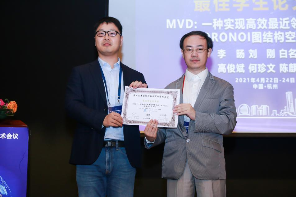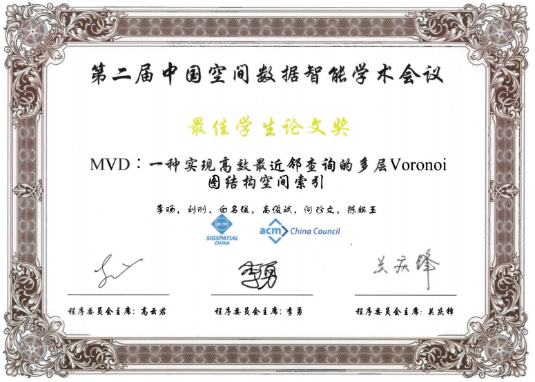 2021年4月24日,为期两天的第二届中国空间数据智能学术会议(SpatialDI 2021)在杭州市浙江宾馆圆满闭幕。以公司博士研究生李旸为第一作者,以刘刚教授为通讯作者的论文《MVD:一种实现高效最近邻查询的多层Voronoi图结构空间索引》荣获会议最佳员工论文奖。该论文针对传统树形索引主要存在的结构失衡和节点重叠问题,提出了一种基于多层Voronoi图结构的空间索引方法,提升了大规模空间数据环境下最近邻查询和k近邻查询的检索效率和I/O性能。