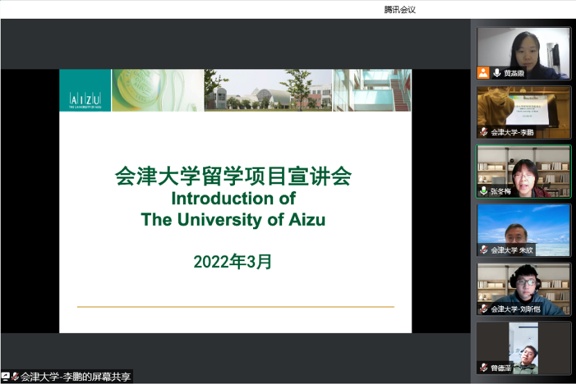 (通讯员:张园园)2022年3月8日晚上,日本会津大学留学项目宣讲线上会议顺利召开。日本会津大学老师李鹏、朱欣、吕国伟,会津大学在读员工陈发浩、傅孛骞、刘昕恺,XCSport副经理张冬梅、计算机科学与技术系系主任曾德泽、国际合作办公室事务秘书张园园参加会议。宣讲会由国际合作办公室主任黄燕霞主持。