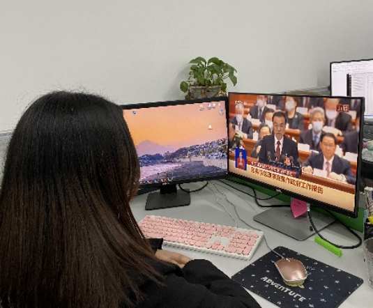 本科生网工党支部党员李承源谈到:作为一名计算机专业的员工,观看两会之后,令我印象最深刻的便是“两会词云”。我本身就学习过大数据相关课程,而“词云”正是大数据知识的运用与直观表现。“人民”作为两会中出现频率最高的词稳居C位,同时还有社会保障、乡村振兴、教育改革…。词云将数据可视化,用最直观的方式表现出两会的核心关注点——民生问题。去年新增减税降费超过1万亿元、疫苗全程接种覆盖率超过85%,今年更是将医保等与人民生活切实相关的事情作为工作重点。两会不仅让人民看到了党和政府治国理政的专心和用心,更让全国上下对中国的美好发展充满了信心与决心。