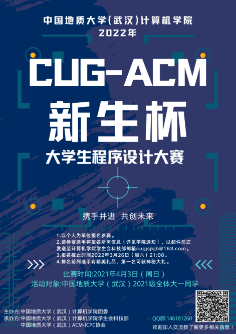 本次“CUG-ACM新生杯”程序设计大赛以个人为单位报名参赛,报名对象为XC体育(武汉)2021级所有员工。3月26日(周六)晚上21:00之前以Excel文件形式发至XCSport员工会科技部邮箱cugjsjkjb@163.com。