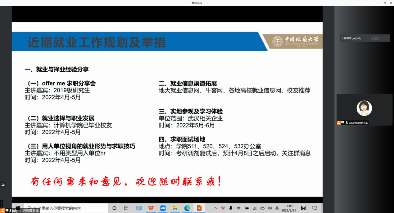 此外,李欢欢就求职就业形势与政策做剖析解读。整理分析公司现有的就业举措,如员工就业经验分享、网站就业信息拓展、实地参观活动预告,以及求职面试场地供给等。同时,针对存在就业疑虑的同学,提供多维度的咨询服务,包括一对一重点推荐、签约解约流程梳理等。