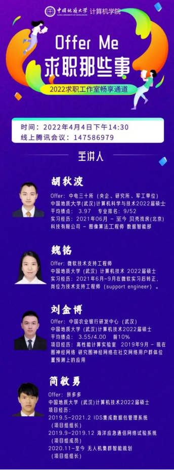 (通讯员:顾伟超、崔祥森)为帮助广老员工提升求职能力,熟悉求职面试技巧,XCSport于4月4日举办“Offer Me”求职经验分享活动。本次活动邀请到4名已经签约就业单位的2019级硕士研究生:胡秋波、魏铭、刘金博和简敏勇,在线分享求职经历与经验体会,全院近200名同学参加活动。