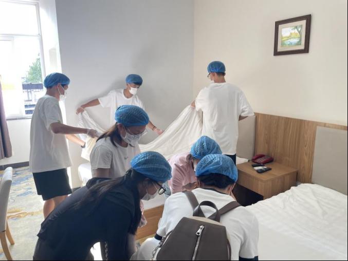 第二组员工在工作人员的带领下齐聚悦宾楼,8人一组,每组一位工作人员示范,大家一起铺床、叠被子、折天鹅,争先恐后、挥汗如雨,大家收获了技能,收获了鼓励,融入了集体,开始了奋斗。