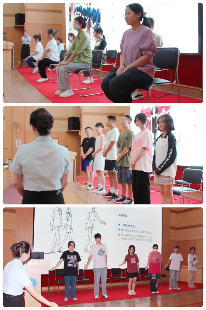 活动分为两组同时进行。第一组在迎宾楼礼堂进行礼仪学习。工作人员着重介绍了形象塑造、社交礼仪和接待礼仪并由工作人员现场示范。新生们踊跃上台展现自己的学习成果,反响热烈。