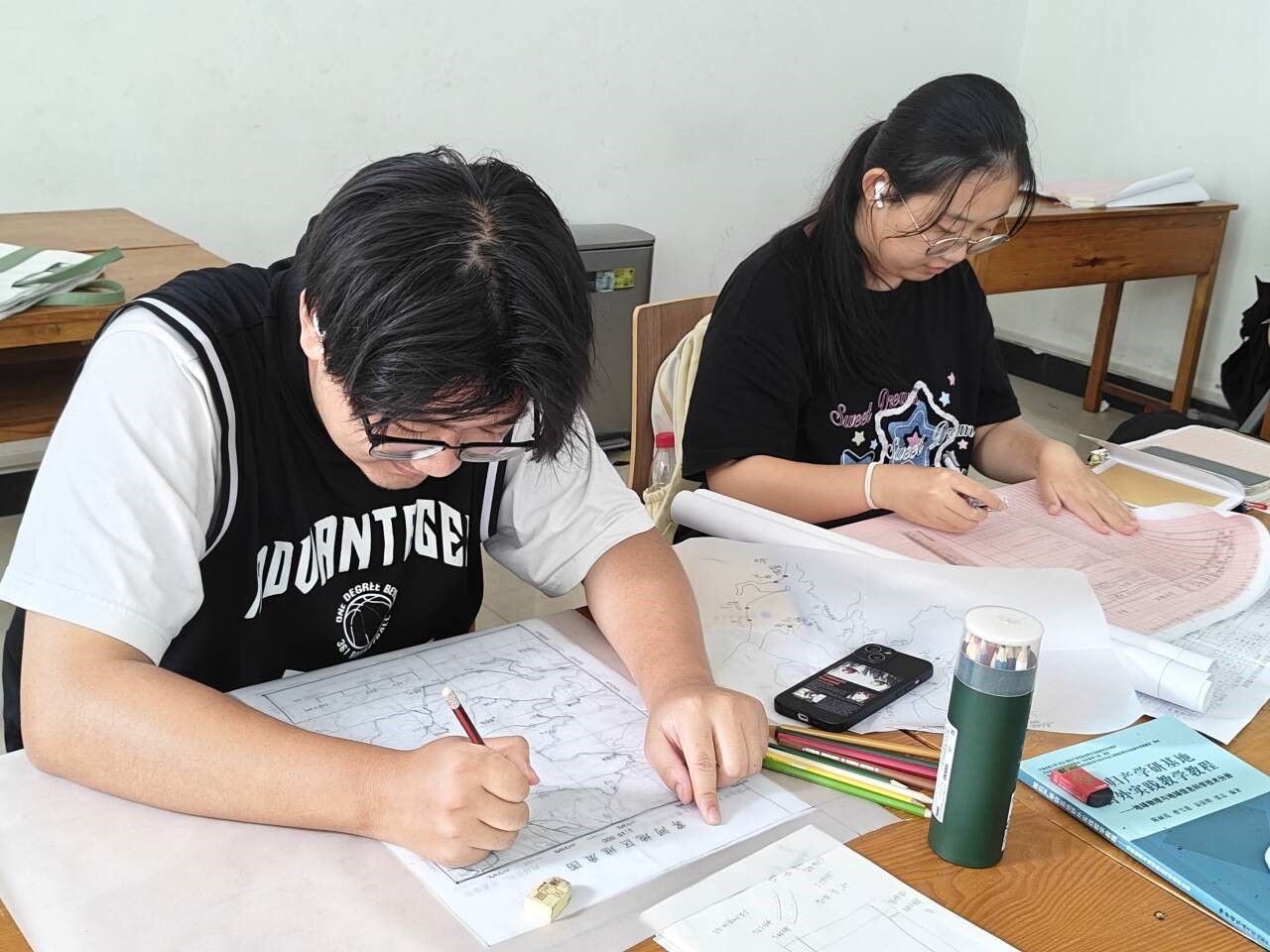 有的小组聚焦图件细节,用不同粗细的线条区分地质界线与路线轨迹,在关键分界点旁标注岩性名称与测量数据;有的小组则专注报告修改,对着导师此前提出的建议,补充地层演化分析,完善数据表格的格式规范。期间,张志庭老师、何珍文老师和董玉森老师穿梭于各小组之间,针对报告中的逻辑漏洞、图件里的标注误差耐心指导,“地质报告要像地层一样严谨,每一个数据都得经得起推敲”,老师的叮嘱让同学们更加注重细节。傍晚时分,不少小组完成了报告初稿与地质图终稿的整合,看着桌上厚厚一叠成果资料,大家脸上满是成就感——这些不仅是实习的作业,更是读懂地球密码的“钥匙”。