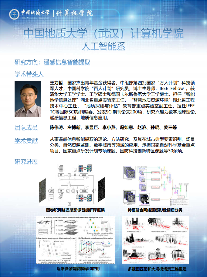 主要开展遥感信息智能提取、知识图谱、自然语言处理、数据挖掘与机器学习等方向的理论、方法研究,在城市典型要素识别、自然资源监测、数字城市、网络、安全、金融、地球科学、生物科学等方面形成特色应用。共有专任教师19人,其中学术带头人3人;近年来,承担国家重点研发计划、国家自然科学基金重点项目、国家科技重大专项、国家自然科学基金等国家级和省部级项目20余项;在计算机类权威期刊及重要学术会议、遥感信息处理权威期刊发表论文100多篇,获得省部级科技成果多项,获得国家发明专利20余项。(数据截至2021年4月)