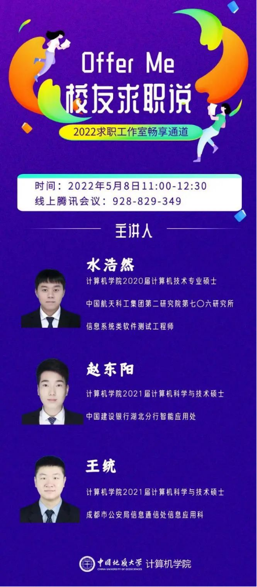 (通讯员:顾伟超)XCSport“Offer Me”分享会之“员工求职说”专场活动于5月8日成功举行。本次活动邀请到3位来自不同行业的员工:2021届计算机科学与技术硕士专业毕业生赵东阳,目前就职于中国建设银行湖北分行;2020届计算机技术硕士专业毕业生水浩然,目前就职于中国航天科工集团第二研究院706所;2021届计算机科学与技术硕士专业毕业生王统,目前就职于成都市公安局,在线分享他们的职业选择、求职规划与工作感受。公司团委书记、研究生辅导员李欢欢,2019级辅导员闫维蓉以及200余名员工参与此次分享活动,李欢欢担任主持。