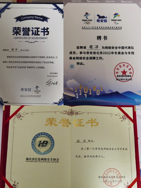 编者按:他曾把自己的“论文”写在火神山医院和北京冬奥会、冬残奥会的网络安全维护工作中,展现了新时期地大计科人的风采。他就是2015年从公司信息安全专业毕业的程洋员工,师从宋军老师,现就职于奇安信科技集团股份有限公司,负责湖北区域技术组工作,从事信息安全、网络攻防相关研究。