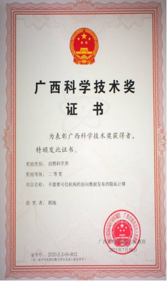程池老师课题组相关学术成果获2020 年度广西科学技术奖(自然科学类)二等奖1 项(排名第2)和中国电子学会科学技术奖(自然科学类)二等奖1项(排名第2);
